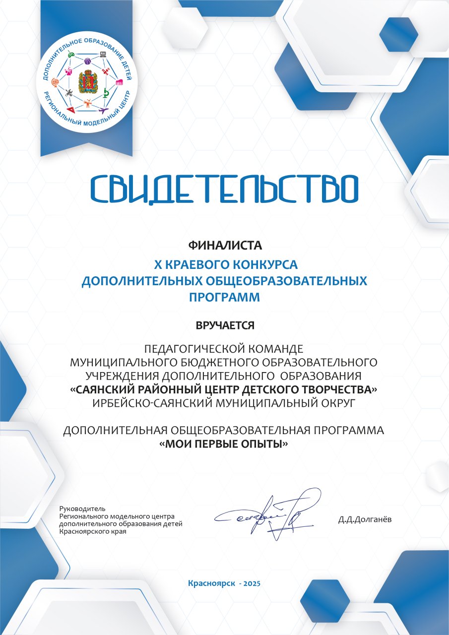 Завершился X краевой конкурс образовательных программ дополнительного образования. По итогам краевого конкурса образовательных программ дополнительного образования программа Центра детского творчества «Мои первые опыты» (педагог Кобяк Елена Святославовна) вошла в число программ финалистов конкурса.