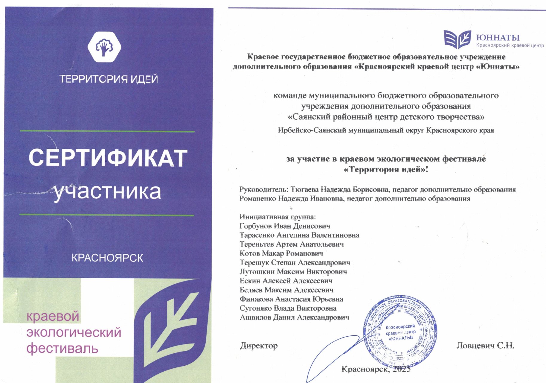 Участие в краевом экологическом фестивале «Территория идей», который объединил защитников природы и исследователей экологии со всего Красноярского края, приняли обучающаяся Центра детского творчества Тарасенко Ангелина и педагог дополнительного образования Романенко Надежда Ивановна.